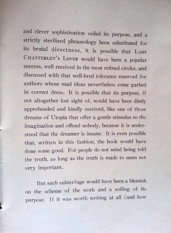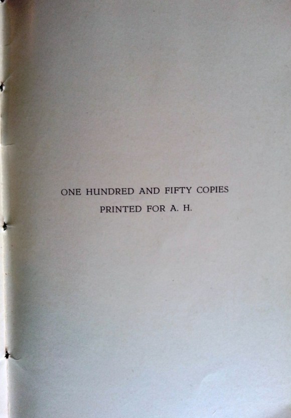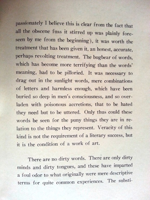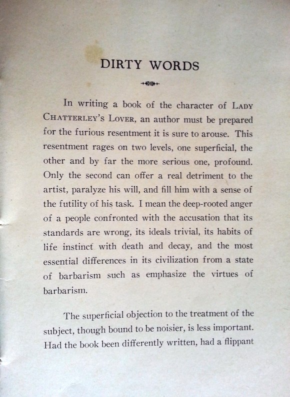 “Dirty Words” offers a fascinating glimpse into the ways in which the writer, first of all, perceived Lawrence’s own use of language in Lady Chatterly and, secondly, observations on those who labeled Lawrence’s use of language obscene and sought to have his work expurgated, censored, or repressed. One hundred and fifty copies of this pamphlet were printed “For A.H.”