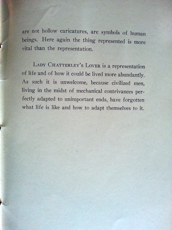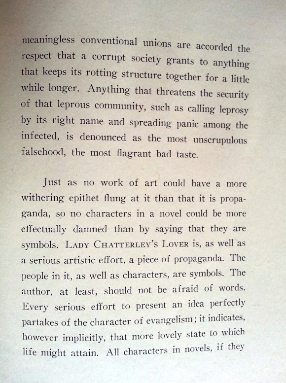Ultimately, the writer indicts Chatterley critics for raising an uproar over “mere combinations of letters and harmless enough, which have been buried so deep in men’s consciousness, and so over-laden with poisonous accretions, that to be hated they need but to be uttered.” The author continues, “If sex has become a foreign [impure] element in modern life, then modern life, not sex, is the thing to be cleansed.”
