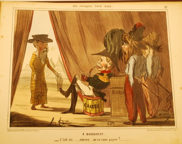 Another bound set of Daumier’s work in the Salisbury House collections is entitled “Les Cosaques Pour Rire,” or, “The Cossacks in Jest.” Daumier created these images during the Crimean War (1853-1856), and used his considerable skills to skewer Russian military command, soldiers, and the czar, though not all the images included in this set necessarily pertain to either the Crimean War or to the Cossacks.