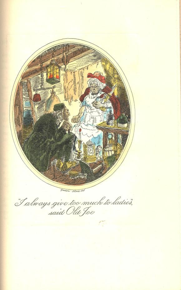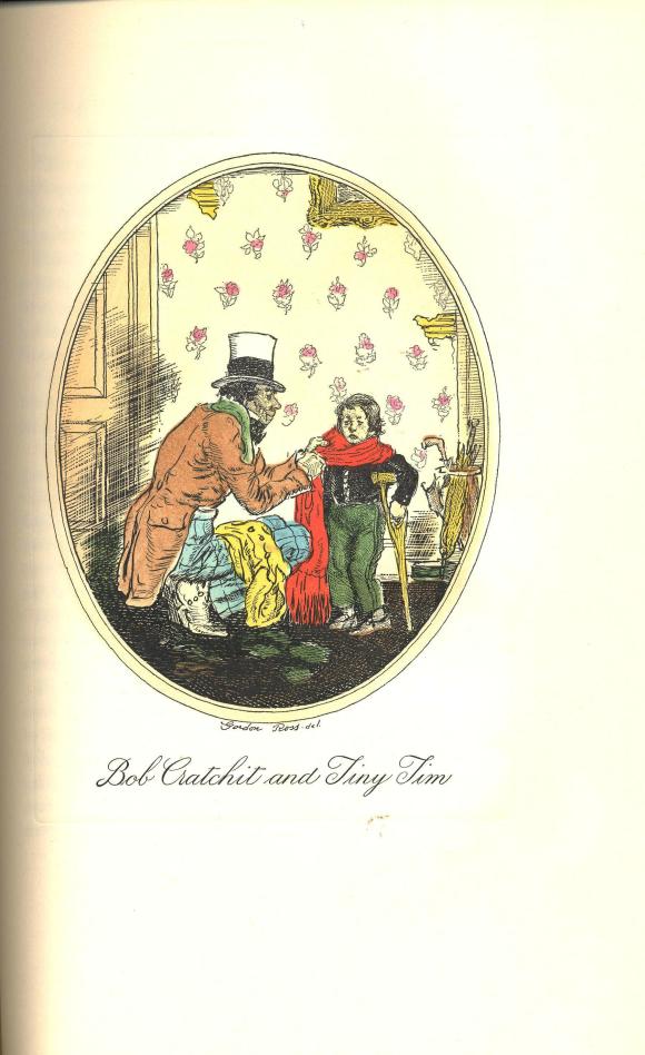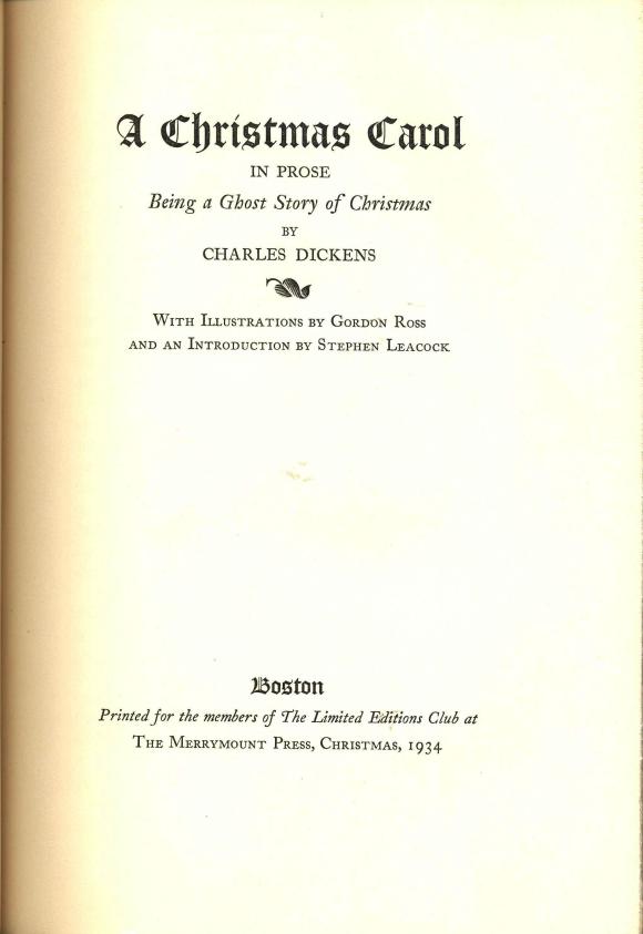 Perhaps Dickens’ social critique of business running roughshod over the working man and his family found more purchase in the winter of 1934. That December, the Limited Editions Club published A Christmas Carol for its members. The book was printed a week before Christmas and found a place on the shelves in Carl Weeks’ library at Salisbury House soon thereafter. The cover featured stylized Christmas trees, and Gordon Ross’s illustrations accompanied Dickens’ text.