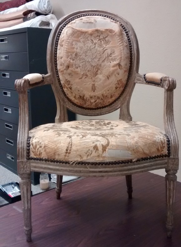 Textile preservation is underway at Salisbury House. The pair of Louis XVI style armchairs currently residing in Edith’s Dressing Room has certainly seen better days. The sunshine from the nearby window has not been kind to these two lovely ladies over the years. With the new curtains being installed in this room by the end of December, it was time to stabilize the chairs’ upholstery and preserve what remains of it.