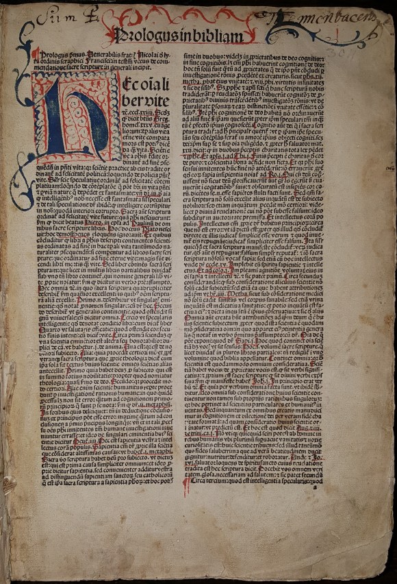 Back at Strassburg in 1472, Johann Mentelin was hard at work on a mammoth production of Nicholas of Lyra’s Postilla super totam Bibliam, which was the first major work of commentary on the bible. Some accounts suggest that Mentelin learned his craft from Gutenberg himself. At any rate, the book produced by Mentelin is a show-stopper. It includes decorated capitals, rubrication, innovative design and, delightfully, annotations from some long-ago reader.