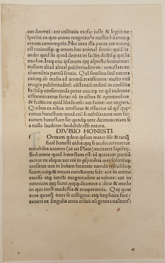 Gutenberg worked primarily in Mainz, a city in modern-day Germany. Soon thereafter a robust trade in printing emerged in Venice, where deep Italian pockets bankrolled book production for generations. Two Bavarian brothers, John and Wendelin de Spire, established one of the first presses in Venice in 1469. The incunabula leaf pictured here was printed by Wendelin in 1472 and is from an edition of Cicero’s On Duty.