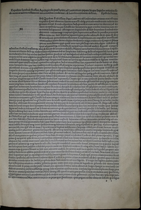 The last of Carl Weeks’ incunabula collection dates to 1496. The Epistolae Sancti Hieronymi, or the letters of St. Jerome, rolled off the Venetian press of Johannes Rubeus Vercellensis in 1496. Interestingly, the book was printed to include rubrication and illustrated capitals; however, our edition only includes the blank spaces where these additional decorative elements would have been added.
