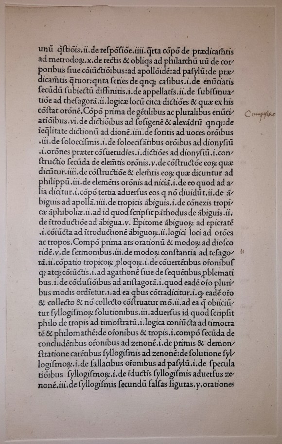 Venice in 1475 was a wonderful confluence of geography and talent: in addition to the de Spire brothers, Nicolas Jensen, roundly considered one of history’s greatest printers and typographers, turned out beautiful volumes from his Venetian workshop. The leaf pictured is from Jensen’s edition of Diogenes Laertius’ Lives of the Philosophers remains representative of his incomparable design and execution.