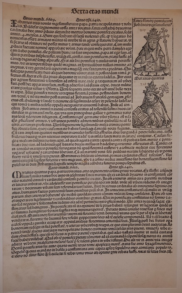 Typically, the authors of most books printed during the incunabula period were already dead. Werner Rolewinck was one of the few exceptions. His Fasciculus temporum combined secular history with biblical history and commentary. This edition was published in Strassburg in 1490, likely by Johann Pruss.