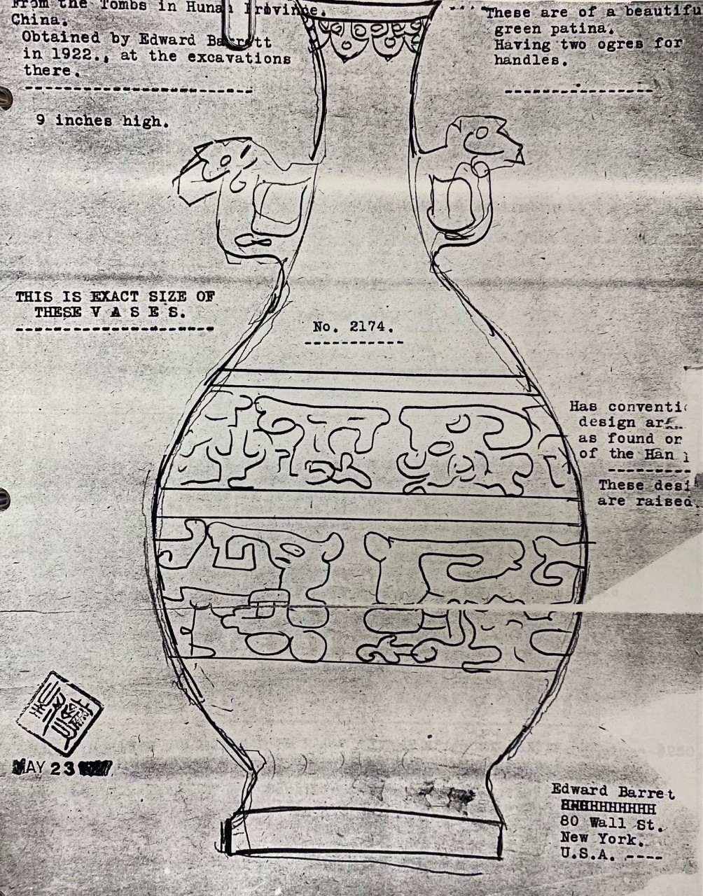 In his sales invoice, Barrett detailed a thrilling provenance full of discovery, excavation, possible grave theft, and intrigue. The documents associated with the vases stated that they were excavated by Edward Barrett in 1922 from an ancient Han dynasty grave in the provenance of Hunan, China, near the city of Cheng Chow.