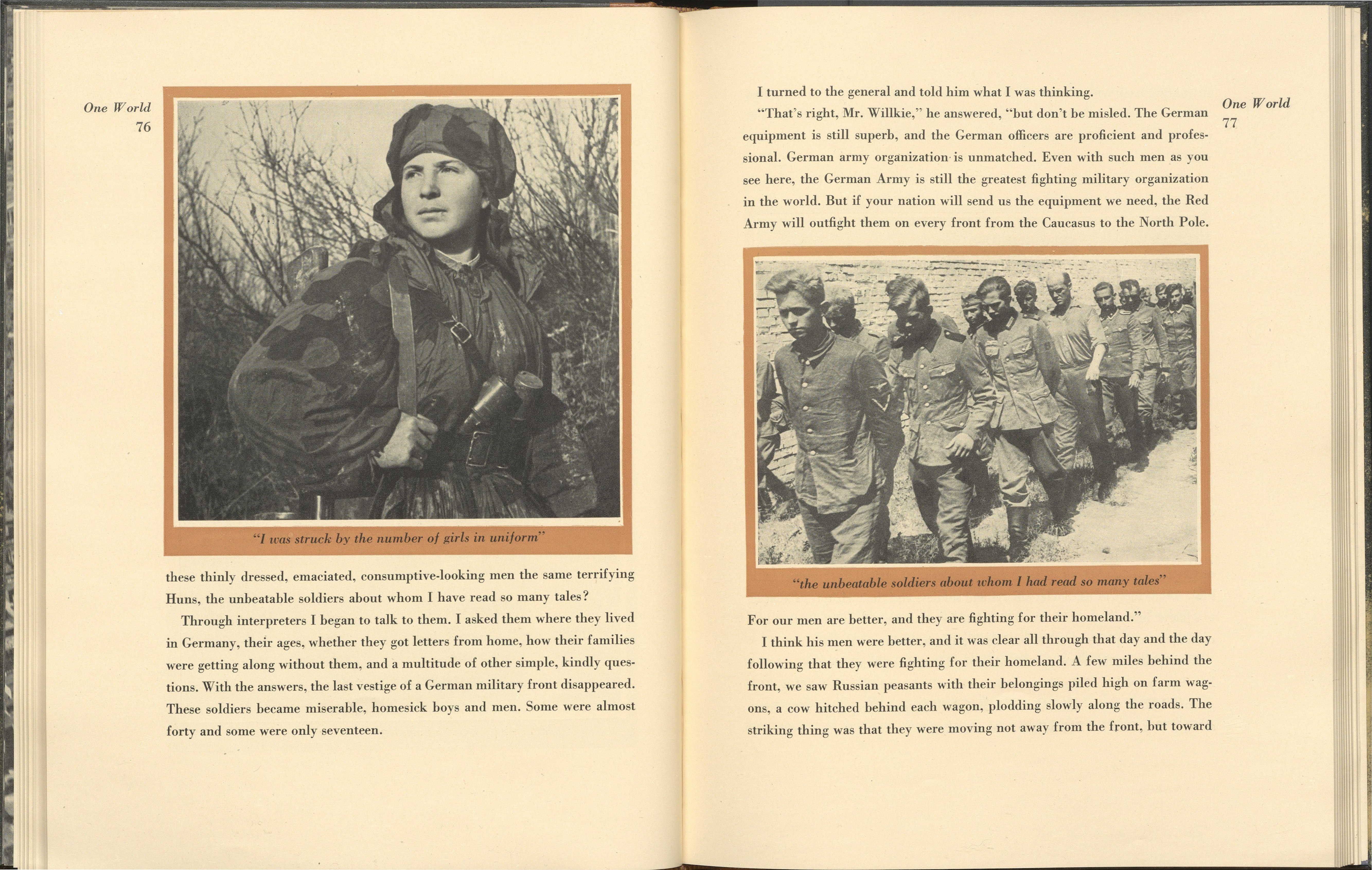 In One World Willkie sought to impart to Americans an understanding of an interconnected world and that “our thinking in the future must be world-wide.” Through his travels he met with citizens and world leaders of Allied nations, chronicling particularly his visits to Cairo, Russia, and China. In his writing he advocates for the end to colonialism, calls for international collaboration, and the necessity of civil rights in the US.